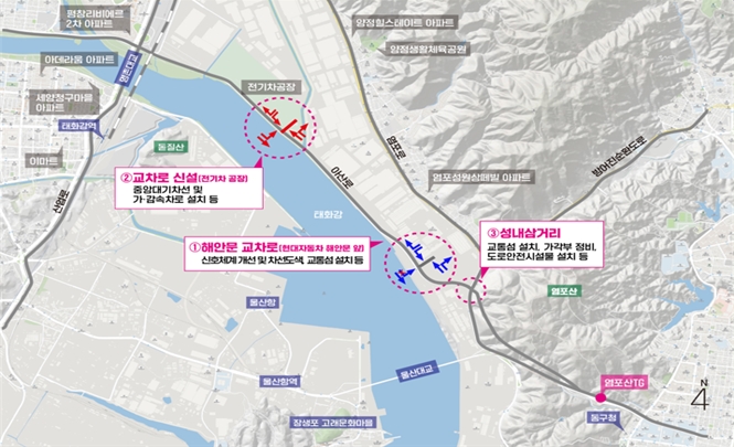 울산시는 아산로의 출퇴근 시간 교통 혼잡 개선을 위해 추진한 교통체계 개선공사가 마무리 단계에 접어들었다고 밝혔다.아산로 전체 교통량은 일일 8만 3,391대, 첨두시간은 6,258대의 높은 교통량을 보이고 있다. 염포산터널의 경우 지난 2023년 통행료 무료화 이후, 하루 평균 교통량이 2만 8,367대에서 3만 3,