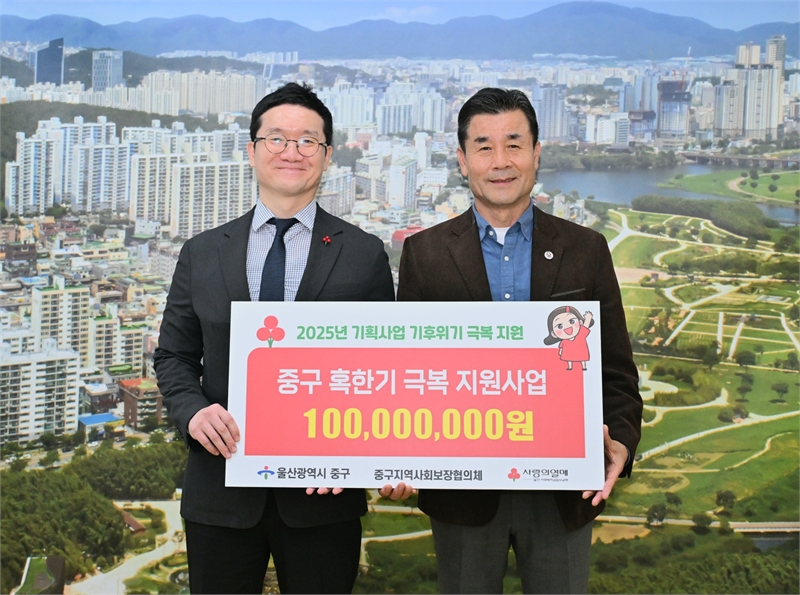 울산사회복지공동모금회(회장 전영도)가 10월 31일 오후 3시 30분 중구청 구청장실을 찾아 2025년 기획사업 ‘기후위기 극복 지원사업’ 배분금 1억 원을 전달했다. 이번 전달식에는 김영길 중구청장과 양호영 울산사회복지공동모금회 사무처장, 차정하 울