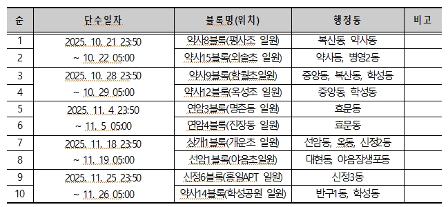 해당 기간 ▲중구 복산·약사·병영2·중앙·학성·반구1동 일부 지역 ▲남구 선암·옥·신정2·대현·야음장생포동 일부 지역 ▲북구 효문동 일부 지역에서 순차적으로 단수가 진행된다.