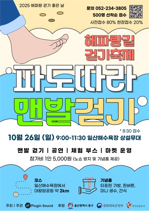 울산 동구가 오는 10월 26일(일) 오전 9시부터 11시 30분까지 일산해수욕장 상설무대 일원에서 ‘2025 해파랑길 걷기 축제 – 파도 따라 맨발 걷기’를 개최한다.