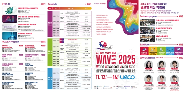 울산시는 11월 12일부터 14일까지 유에코(UECO)에서 ‘인공지능(AI), 울산 산업의 미래’를 주제로 ‘웨이브(WAVE) 2025 울산세계미래산업박람회’를 개최한다고 밝혔다.