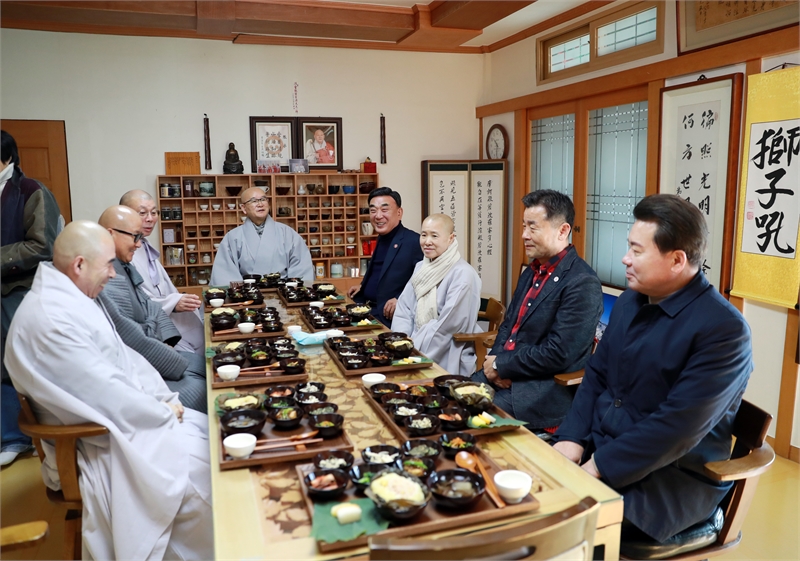 울산불교종단연합회(회장 혜원 스님) 주최로 6일 백양사 앞마당에서 열린 제 14회 울산 전통음식 문화 한마당에서 사찰음식 명장 선재스님의 안내로 김두겸 울산시장과 김영길 중구청장,임현철 울산시 대변인,백양사 주지인 지선스님을 비롯한 사찰 큰스님들이 전통음식 전시를 관람하고 있다. /울산시 제공 0 0 시사인 투데이 박태환 besthammer@naver.com 박태환의 기사 더보기 저작권자 ⓒ 시사인 투데이, 무단 전재 및 재배포 금지