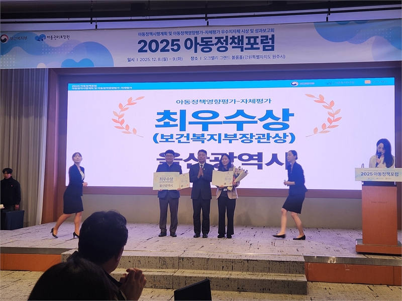 울산시는 12월 8일 보건복지부 주관 ‘2025년 아동정책영향평가’에서 광역지자체 중 유일하게 ‘최우수’ 지자체로 선정돼 보건복지부장관 표창을 받았다고 밝혔다.