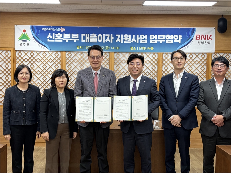 울산 울주군이 신혼부부의 주거비 부담을 완화하고 안정적인 정착을 위해 추진 중인 ‘신혼부부 대출이자 지원사업’ 협약은행을 확대한다고 12일 밝혔다.울주군과 BNK경남은행 울산영업그룹은 이날 군청 은행나무홀에서 이순걸 울주군수와 황재철 BNK경남은행 울산영업그룹장 등이 참석한 가운데 신혼부부 대출이자 지원사업 업무협약식을