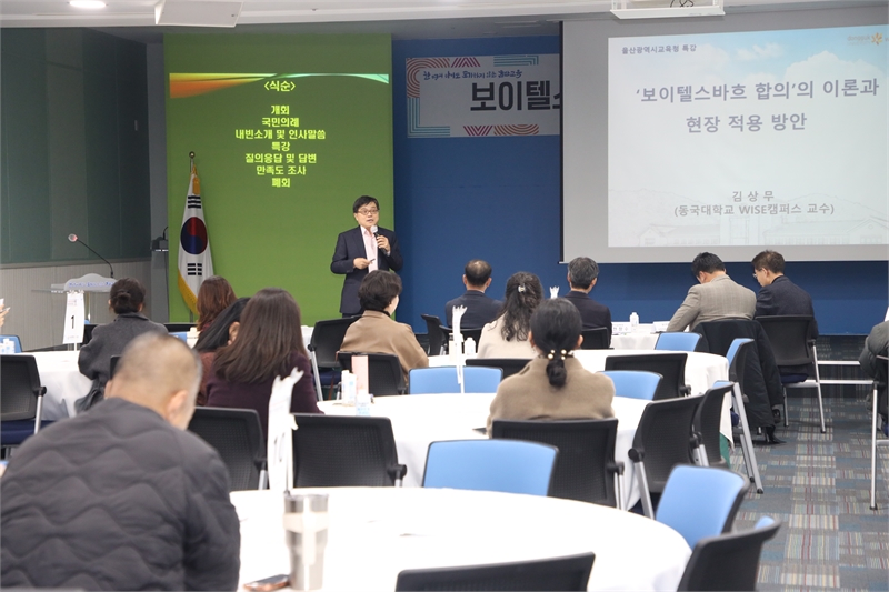 울산광역시교육청(교육감 천창수)은 9일 외솔회의실에서 교직원과 교육전문직원을 대상으로 ‘보이텔스바흐 합의 이론과 현장 적용 방안’을 주제로 특강을 열었다.이번 특강은 국정과제인 ‘시민 교육 강화를 통한 전인적 역량 함양’과 2026년 울산교육청 민주시민교육 정책 방향에 따라 참여와 실천 중심의 민주시민교육 역량을 높이고