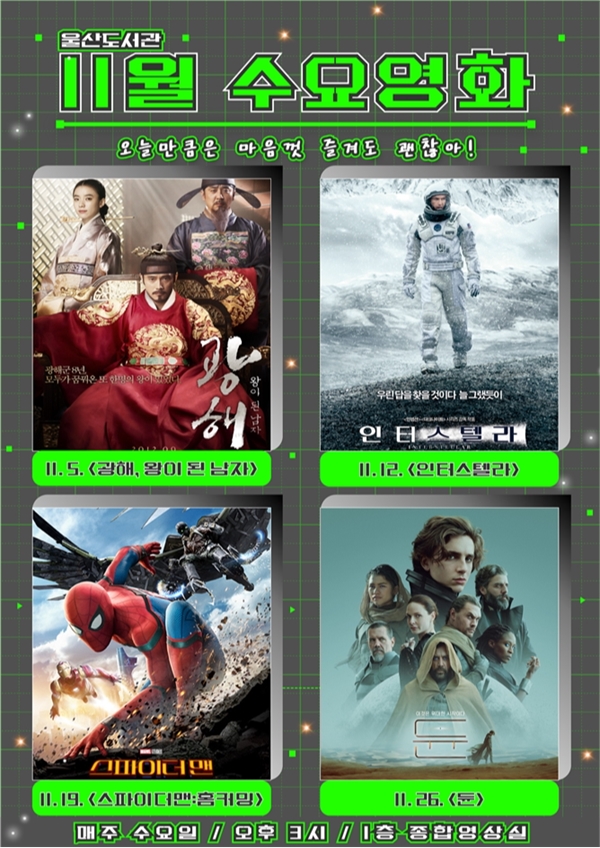 울산도서관이 11월 한 달 동안 매주 수요일 오후 3시, 도서관 1층 종합영상실에서 ‘오늘만큼은 마음껏 즐겨도 괜찮아’를 주제로 영화를 상영한다.이번 달 영화는 수능을 마친 수험생은 물론 시민 모두가 함께 어울려 휴식과 여유를 느낄 수 있는 다양한 분야(장르)의 작품들로 구성됐다. ▲11월 5일에는 왕의 대역으로 궁에