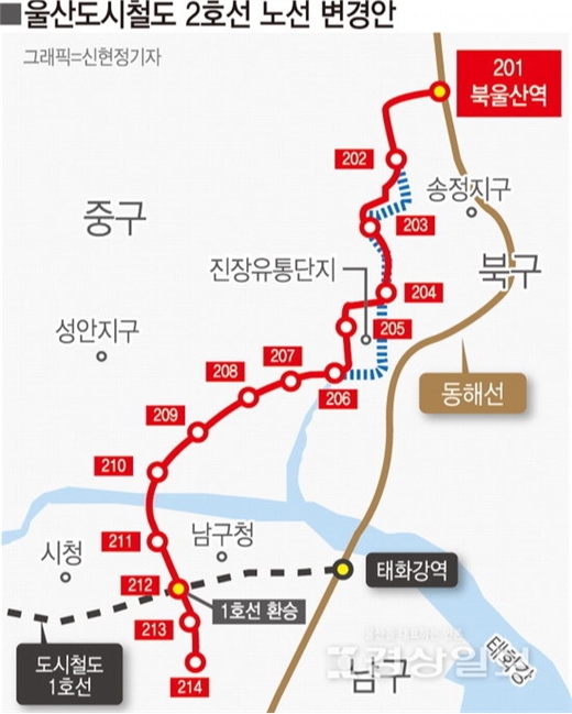 도시철도 2호선은 사업비 4,400억 원을 투입해 오는 2032년 개통을 목표로 추진하고 있는 사업이다. 운행 구간은 북울산역을 기점으로 북구 진장유통단지를 거쳐 중·남구 번영로를 통해 남구 야음사거리까지 13.55km이며, 정거장 14곳이 설치된다.