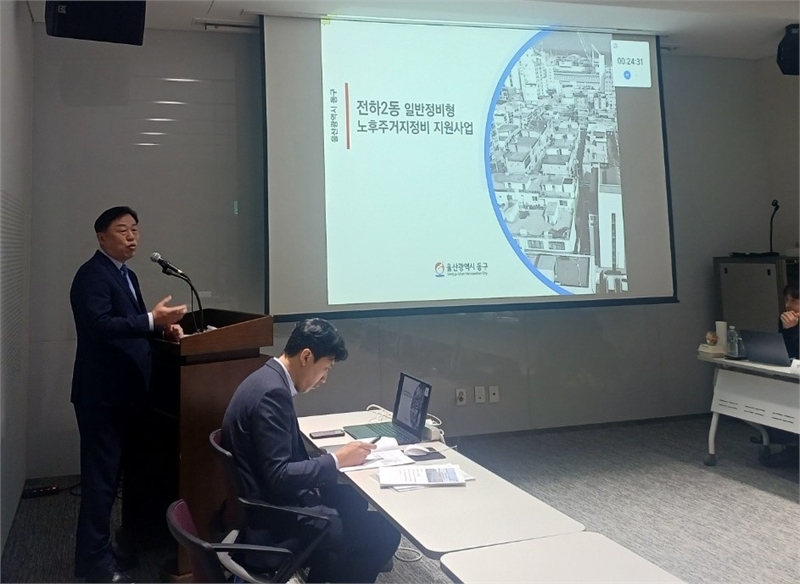 김종훈 울산 동구청장은 4일 청주시 청주오스코에서 열린 국토교통부의 '2025년 노후 주거지 지원사업' 발표 평가'에 참여해 동구가 방어동과 전하2동 일대에서 추진중인 도시재생사업에 대해 직접 발표했다. /동구청 제공